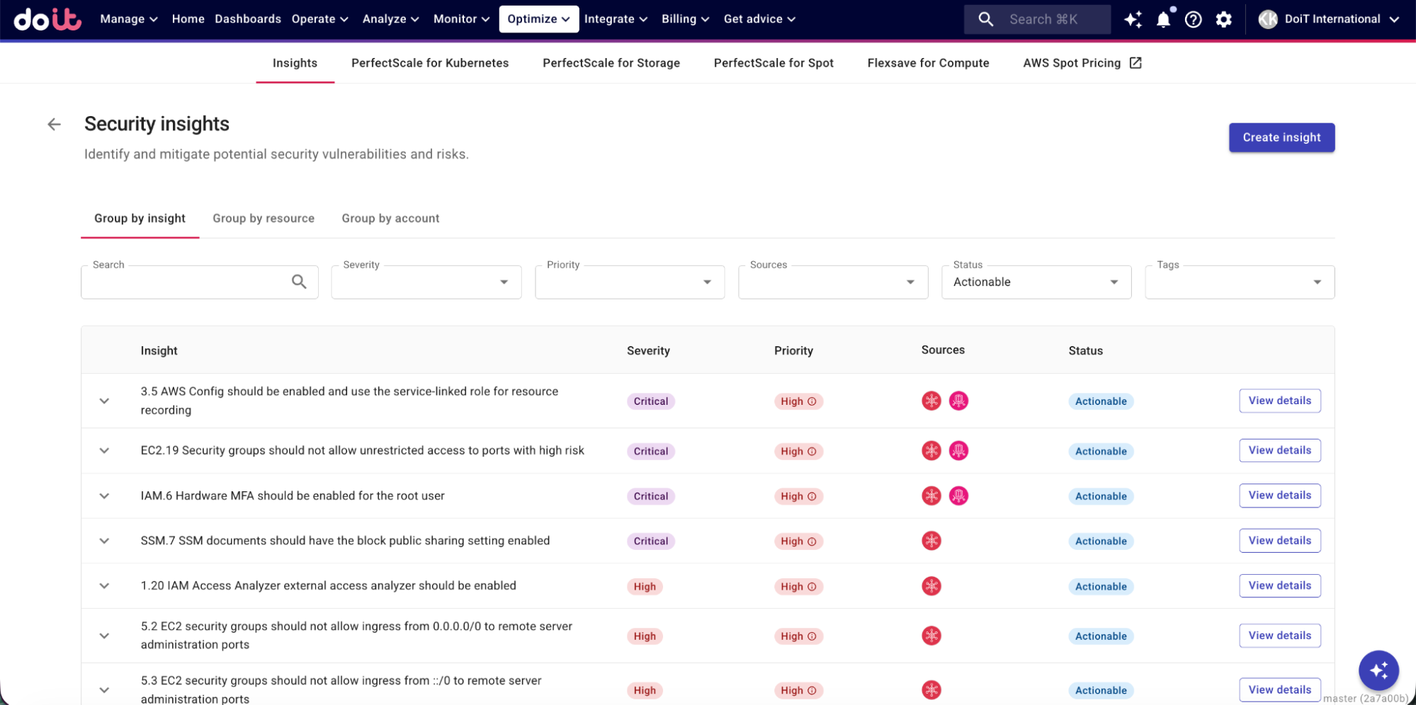 DoiT Security Insights brings your security signal, context, and actions together in the DoiT platform. It reduces alert noise by grouping duplicate findings across multiple CSPM providers; explains why something is urgent with transparent, adjustable Priority Scores; and gives every role the right view - by Insight, Resource, or Account. You can take action on that signal immediately: engage a DoiT security expert. And because Security lives alongside the rest of Insights, teams can prioritize fixes in the same place they manage cost, performance, and reliability - shortening MTTR, improving audit readiness, and focusing effort where it has real business impact.