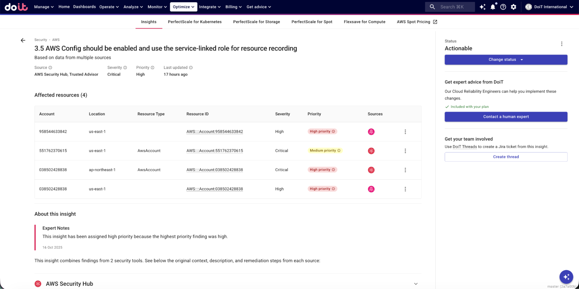 Access the Insight Detail page to find affected resources, current status (Actionable, In Progress, Acknowledged, Dismissed), the original vendor context and remediation steps, as well as the Priority Score rationale. From the same view, you can directly contact a DoiT expert or create a Thread to push a Jira ticket - while keeping evidence attached. That closes the loop without tool-switching, reduces MTTR, and leaves an auditable trail from detection to resolution.