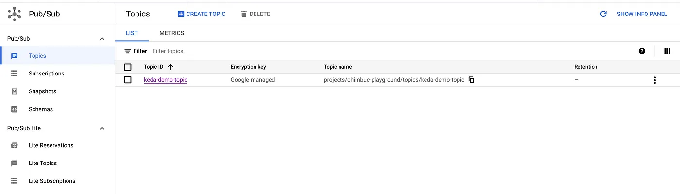GCP_PROJECT_ID=$(gcloud config get-value project) TOPIC_NAME=keda-demo-topic SUBSCRIPTION_NAME=keda-demo-topic-subscription # Create Topic gcloud pubsub topics create $TOPIC_NAME --project $GCP_PROJECT_ID # Create Subscription gcloud pubsub subscriptions create $SUBSCRIPTION_NAME \ --topic $TOPIC_NAME \ --project $GCP_PROJECT_ID