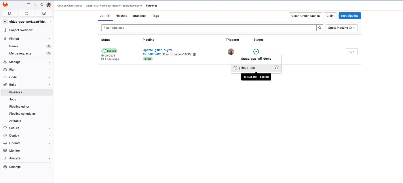 In the previous steps, we configured the workload identity pool to trust the identities from my personal Gitlab namespace. No configuration changes are required in your Gitlab account, and you can enable workload identity federation for individual CI/CD jobs. You can customize the setup based on your requirement.